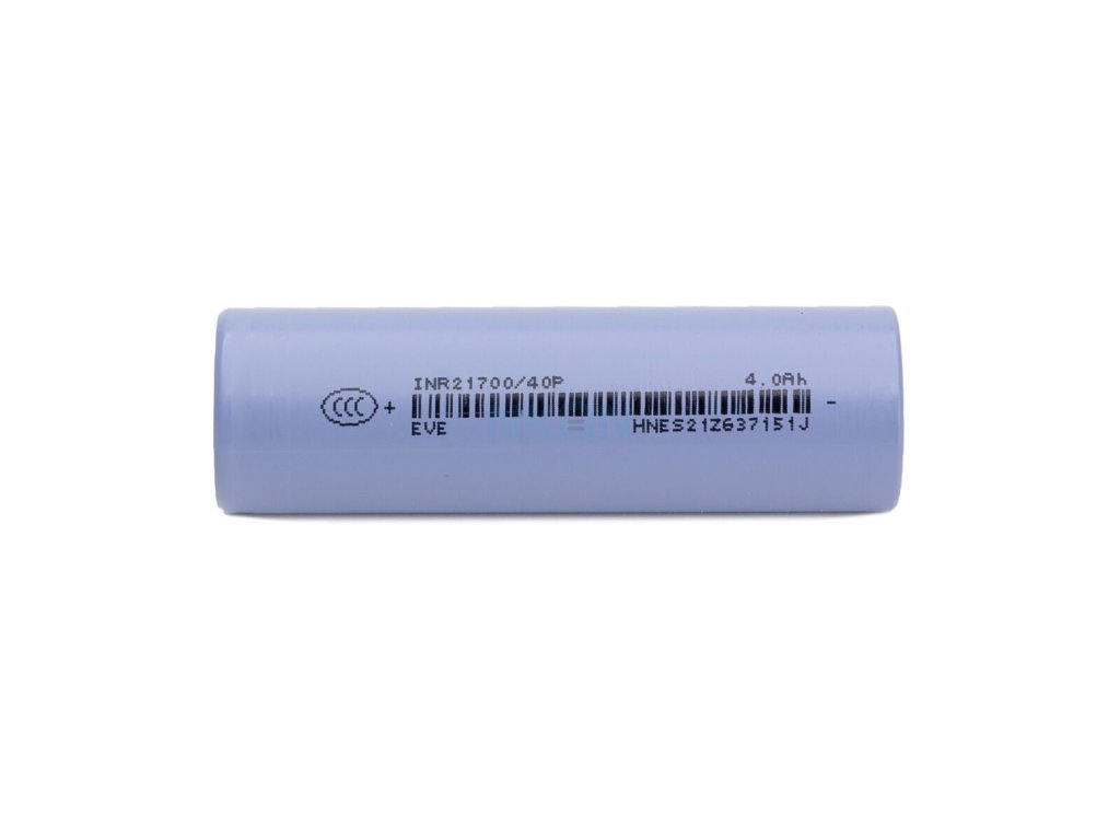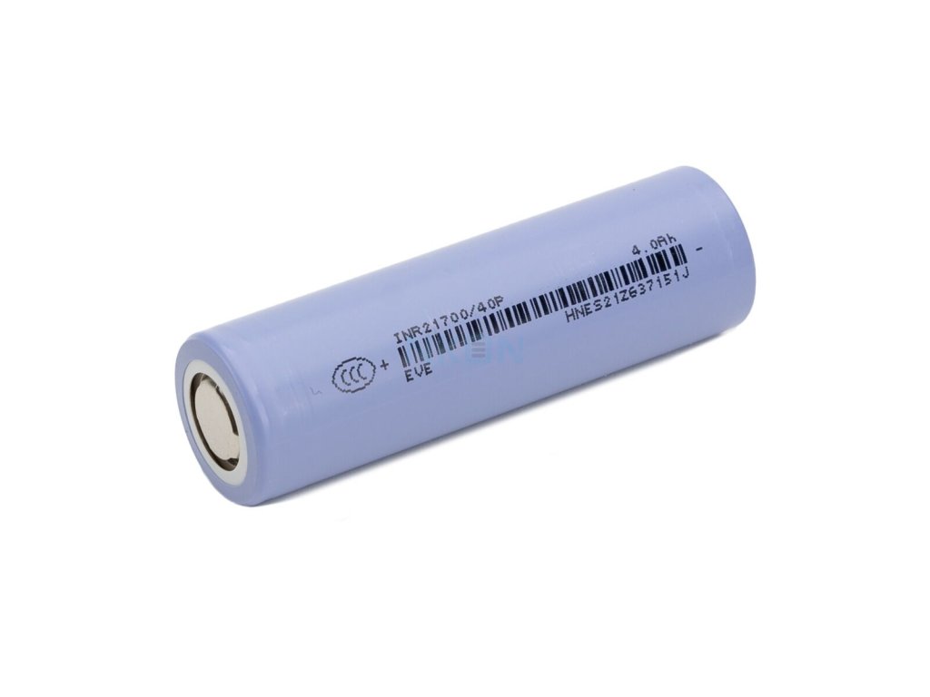 The EVE INR21700-40P is a high-drain Li-ion (NMC) battery cell in 21700 format with a capacity of 4000 mAh. It delivers stable performance, high energy density, and is suitable for applications requiring higher discharge currents such as power tools, e-bikes, battery packs, and portable electronics.